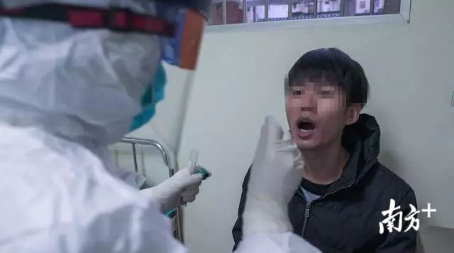 根據(jù)“大排查”的要求,發(fā)熱門診統(tǒng)一對患者開展咽拭子取樣。在穿著層層防護(hù)服的護(hù)士引導(dǎo)下,王勻進(jìn)入隔離間,坐在椅子上,頭微微后仰,嘴巴張大。醫(yī)生王婕妤用壓舌棒固定住他的舌頭,用像棉棒一樣的拭子越過舌根,在咽部后壁上反復(fù)擦拭,收集粘膜細(xì)胞。
