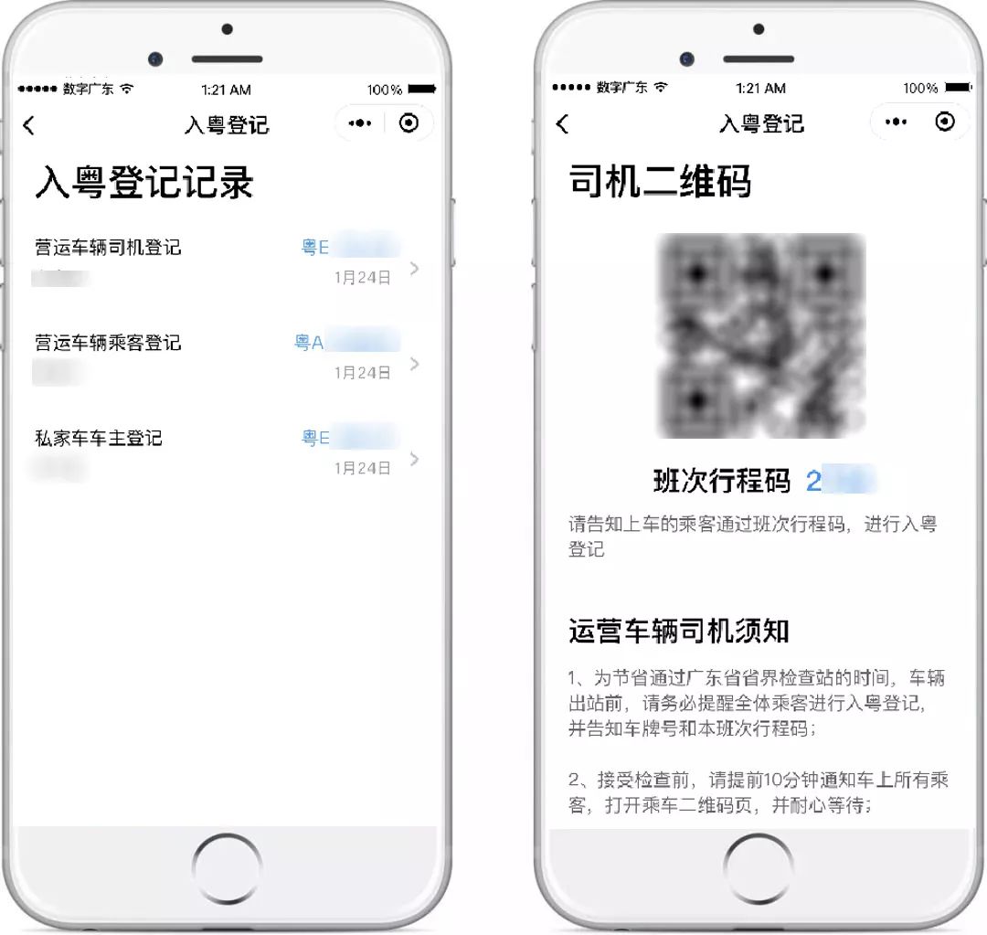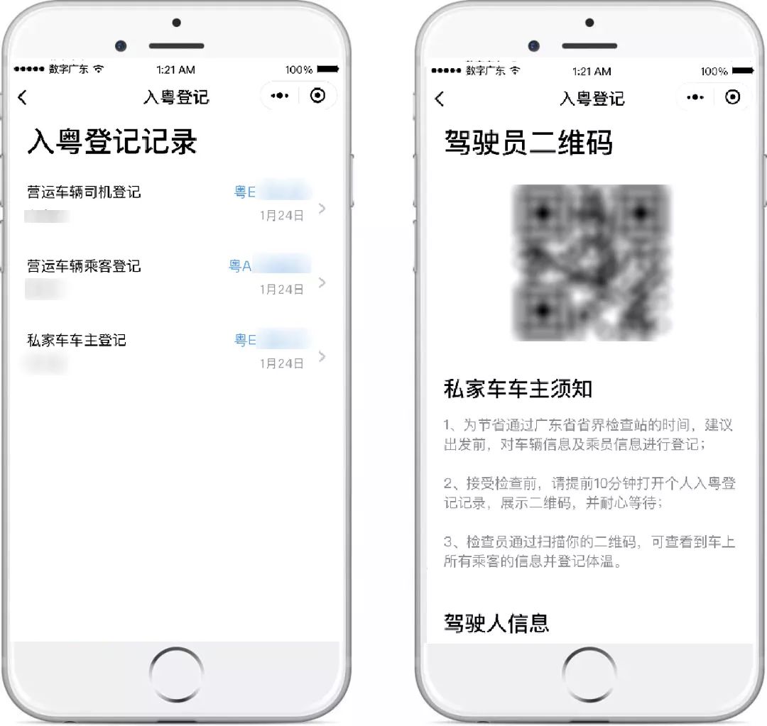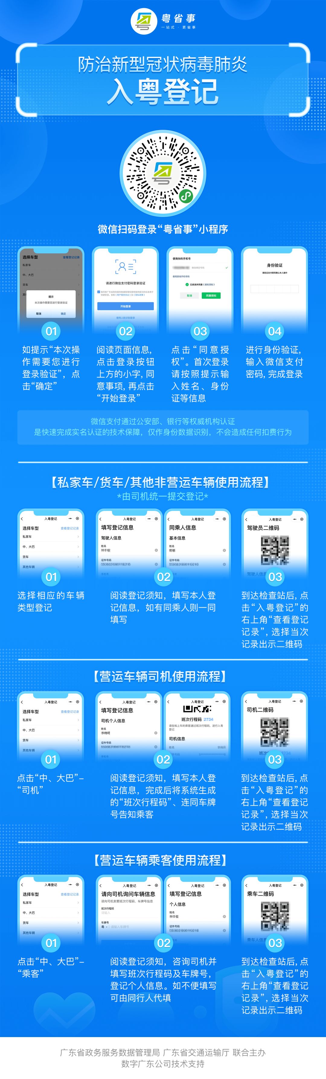 粵省事“疫情防控服務(wù)專區(qū)” 新增“入粵登記”服務(wù) 【“入粵登記”服務(wù)】 “入粵登記”服務(wù)主要面向外來入粵的司機、乘客群體,在進入廣東省時登記個人信息并記錄體溫。 所有進入廣東省內(nèi)的司機乘客都需要進行登記,其中: 1、私家車、貨車、其他車輛由司機填寫入粵登記,如有同乘人,則由司機一同登記。 2、中巴、大巴等營運車輛,司機與乘客分別填寫入粵登記,如有不便操作的乘客,可由同行人代填。 為節(jié)省通過廣東省省界檢查站的時間,建議出發(fā)前應(yīng)提前對車輛信息及乘員信息進行登記,并在進入防疫站檢測前提前打開二維碼界面,以節(jié)省核驗檢查時間。 點擊上方圖片 保存或轉(zhuǎn)發(fā)“入粵登記”流程 給身邊的人 一起提前登記,快速通過防疫站 下面一起來看看 “入粵登記”的詳細操作介紹 和常見問題解答吧 “入粵登記”服務(wù)入口 (1)微信搜索進入“粵省事”小程序,首頁“抗擊疫情”版塊,點擊“入粵登記”服務(wù)。 (2)微信搜索進入“粵省事”小程序,下滑至“專區(qū)”版塊點擊進入“疫情防控服務(wù)專區(qū)”,或直接點擊下方圖片進入專區(qū)。 進入“疫情防控服務(wù)專區(qū)”后,下滑點擊“入粵登記”,司機或乘客可根據(jù)實際情況選擇類型進入登記。后續(xù)可從該界面右上角“查看登記記錄”進入找到相關(guān)登記記錄。 私家車/貨車/其他車輛 駕駛?cè)嗽诔霭l(fā)前,點擊進入“入粵登記”服務(wù),選擇相應(yīng)的車輛類型,閱讀服務(wù)須知后填寫駕駛?cè)诵畔ⅲㄗ⒁鉁蚀_填寫號牌種類),如獨自駕駛,確認無誤后可直接提交。 如車上有同行乘客,需一并填報同乘人員信息,點擊“錄入同乘人信息”,可添加多位乘客信息。添加完畢后確認信息并提交即可。 到達檢查站,駕駛員在“粵省事”的“入粵登記記錄”找到對應(yīng)記錄,出示對應(yīng)乘車二維碼,檢查員掃碼核驗,待檢查員測量全車人員體溫、提交信息后通過。 中大巴司機 駕駛員出發(fā)前,進入“入粵登記”服務(wù),點擊“中、大巴”選擇“司機”,并填寫登記信息(注意準確填寫號牌種類),確認無誤后可提交。 到達檢查站,駕駛員進入“入粵登記”服務(wù),點擊右上角“查看記錄”找到對應(yīng)記錄,點擊相應(yīng)車牌,出示對應(yīng)乘車二維碼給檢查員核驗,待檢查員測量體溫、提交信息后通過。 如有乘客詢問班次行程碼也可從此進入獲取。 中、大巴車乘客 乘客在出發(fā)前向司機索取班次行程碼及車牌號,進入“入粵登記”服務(wù),點擊“中、大巴登記”選擇“乘客”,填入班次行程碼及車牌號。 填寫乘客登記信息,確認無誤后可提交。 到達檢查站后,乘客在“入粵登記”服務(wù),點擊右上角“查看記錄”找到對應(yīng)記錄,點擊當次乘坐的對應(yīng)車牌,出示對應(yīng)乘車二維碼給檢查員核驗,待檢查員測量體溫、提交信息后通過。 常見問題答疑 Q:是否支持代辦? 私家車/貨車/其他類型車輛需由司機統(tǒng)一代全車人員辦理;中、大巴車乘客如有多人同行,可由同行人代為辦理。 Q:支持哪些人士辦理,有無戶籍、城市等限制? 支持持有有效二代居民身份證的用戶實名認證后辦理,無城市、戶籍限制,暫不支持港澳、臺灣人士及外籍人士辦理,因此如遇嬰幼兒乘客、港澳人士、臺灣人士、外籍人士等人群,敬請咨詢檢查員其他處理方法。 Q:本人如上報多次記錄以哪條為準? 以用戶出示的二維碼對應(yīng)的記錄為準。 Q:如提交失敗如何處理? 請確認是否網(wǎng)絡(luò)導致,建議切換網(wǎng)絡(luò)或前往良好的網(wǎng)絡(luò)環(huán)境再作嘗試。 Q:在粵省事使用微信支付密碼登錄安全嗎? “粵省事”為廣東省人民政府主辦的移動政務(wù)服務(wù)平臺,保障您的信息安全,本次使用微信支付密碼登錄,僅為了讓您快速實名認證辦理“入粵登記”服務(wù),請放心使用。 Q:從省外入粵,先到廣東A地,再到廣東B地,怎么填? 填寫A地,即初始進入廣東省界所在地市為準。 Q:本來就是粵牌車,從省外入粵是否還要登記? 為加強疫情防控,凡進入廣東省界車輛請按照有關(guān)政策辦理入粵登記。 Q:提前幾天登記可以嗎?現(xiàn)在登記什么時候入粵都可以嗎? 如您已確認行程,為保證您順暢通行,建議您可提前辦理入粵登記。 Q:不登記可以入廣東嗎?? 為加強疫情防控,建議您辦理入粵登記,如因特殊原因無法辦理,請根據(jù)現(xiàn)場聯(lián)合防疫站的工作人員指引通行。 Q:駕駛者不是車主,由駕駛者登記可以嗎? 入粵登記將核查入粵人員信息,如非車主本人入粵,則需由當前駕駛員辦理登記。 春節(jié)后返程高峰即將到來 為打贏疫情防控阻擊戰(zhàn) 保障廣大人民平安暢順出行 請出發(fā)前或入粵前完成入粵登記 以便快速通過各大聯(lián)合檢疫站 馬上點擊圖片進入 “疫情防控服務(wù)專區(qū)” 主管&策劃單位:廣東省政務(wù)服務(wù)數(shù)據(jù)管理局 出品:數(shù)字廣東網(wǎng)絡(luò)建設(shè)有限公司 編輯:許嘉蕙