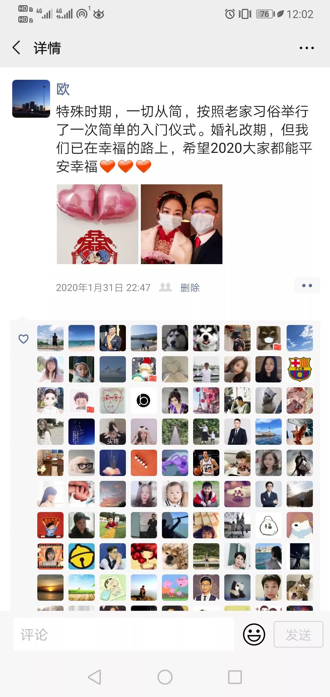 年初七是新娘入門的日子。歐泉強(qiáng)只在家門口放了一段鞭炮,夫妻二人戴上口罩拍了張合照發(fā)到朋友圈告知親朋好友:“特殊時(shí)期,一切從簡(jiǎn),按照老家習(xí)俗舉行了一次簡(jiǎn)單的入門儀式?;槎Y改期,但我們已在幸福的路上,希望2020大家都能平安幸福?!?/p>