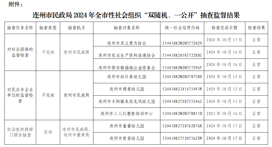 2024年,連州市民政局根據(jù)《國務(wù)院關(guān)于在市場監(jiān)管領(lǐng)域全面推行部門聯(lián)合“雙隨機(jī)、一公開”監(jiān)管的意見》(國發(fā)〔2019〕5號)、《廣東省行政檢查辦法》和《廣東省市場監(jiān)督管理局關(guān)于印發(fā)廣東省市場監(jiān)管領(lǐng)域部門聯(lián)合‘雙隨機(jī)、一公開’抽查工作指引的通知》(粵市監(jiān)信監(jiān)〔2023〕16號)要求,抽取了監(jiān)管對象和執(zhí)法人員名單,開展了雙隨機(jī)抽查工作?,F(xiàn)將抽查監(jiān)督結(jié)果向社會公布: