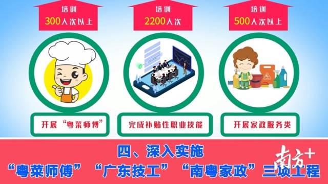 四、深入實施“粵菜師傅”“廣東技工”“南粵家政”三項工程。開展“粵菜師傅”培訓300人次以上。完成補貼性職業(yè)技能培訓2200人次。開展家政服務類培訓500人次以上。(主管部門:市人力資源社會保障局)