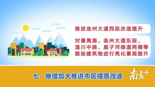 七、繼續(xù)加大推進市區(qū)提質改造。推進連州大道西段改造提升。對番禺路、連州大道東段、湟川中路、星子河綠道兩側等路段建筑物進行亮化景觀提升。(主管部門:市住房城鄉(xiāng)建設局)