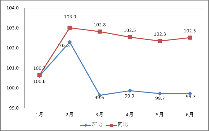 (一)月度CPI數(shù)據(jù)顯示:環(huán)比漲跌互現(xiàn),同比全面上漲。從各月環(huán)比指數(shù)看,1月份受天氣影響,CPI環(huán)比上漲0.6%;2月份受春節(jié)市場(chǎng)需求影響導(dǎo)致環(huán)比上漲2.3%;3月份環(huán)比下降0.4%,春節(jié)過(guò)后,食品、服務(wù)類價(jià)格回落,加上時(shí)令蔬菜大量上市,鮮菜價(jià)格下滑,進(jìn)一步拉動(dòng)食品類價(jià)格回落;4月份受鮮菜、雞蛋等食品類價(jià)格下降影響,從而帶動(dòng)環(huán)比指數(shù)下降0.1%;5月受“豬周期”影響,畜肉類價(jià)格下降明顯,導(dǎo)致環(huán)比指數(shù)下降0.3%;6月份環(huán)比指數(shù)下降0.3%。從各月同比看, 1至6月漲幅分別為0.7%,3.0%,2.8%,2.5%,2.3%,2.5%(見(jiàn)圖1)。