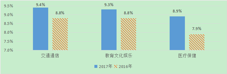 2:2016-2017年醫(yī)療保健、教育文化娛樂和交通通信消費占比情況