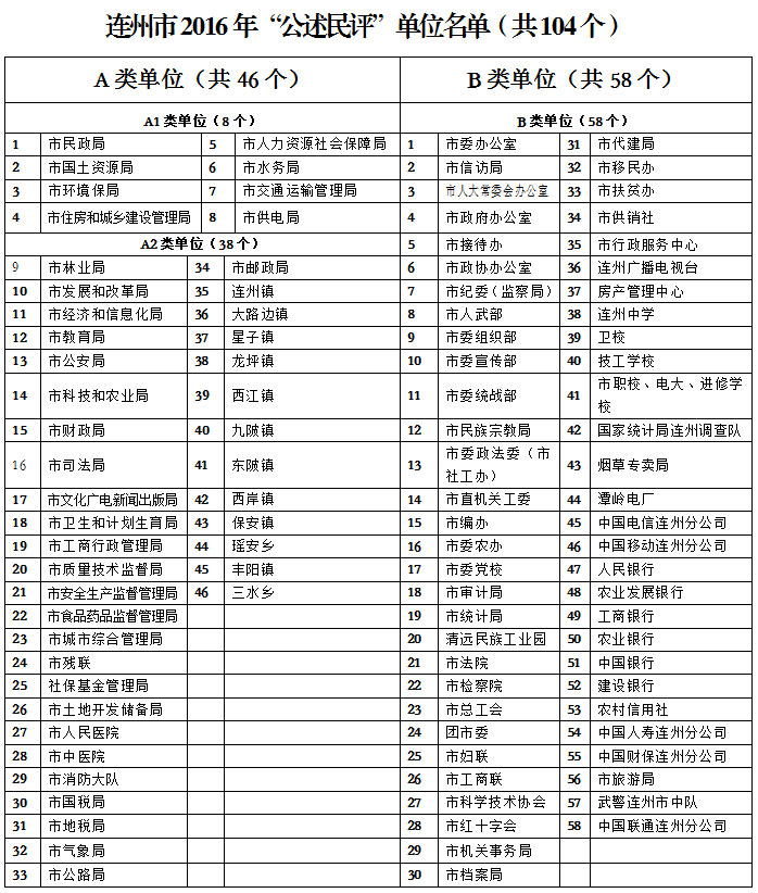 將市直正科以上單位、鎮(zhèn)(鄉(xiāng))以及與社會公眾聯(lián)系密切的省、清駐連單位共104個單位(名單見附件1)列入“公述民評”活動范圍。按照突出重點、重心下移的工作思路,將市民政局、市國土局、市環(huán)保局、市住建局、市水務(wù)局、市供電局、市人社局、市交通局等8個單位列為重點評議單位(A1類),繼續(xù)開展抽檢評議,并對重點評議單位具有行政執(zhí)法或監(jiān)督職能的部分業(yè)務(wù)科室人員進(jìn)行評議,著力解決不作為、慢作為和亂作為的問題。