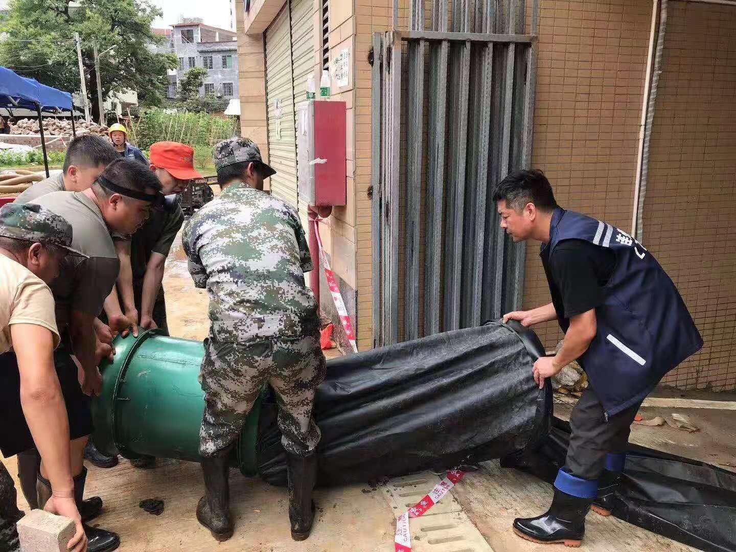 黃國軍和隊(duì)員一起接駁通風(fēng)管 黃國軍在積水車庫指導(dǎo)排水救援工作