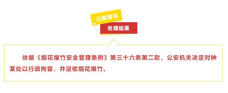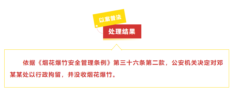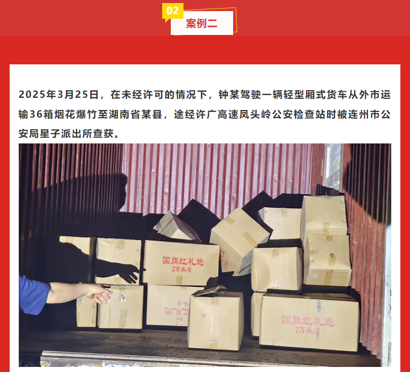 2025年3月24日凌晨,在未經(jīng)許可的情況下,鄧某某駕駛一輛面包車從外縣非法運輸9箱煙花爆竹至湖南省某縣,途經(jīng)我市轄區(qū)時被連州市公安局大路邊派出所查獲。 1、什么是非法生產(chǎn)、銷售、運輸、儲存煙花爆竹? 非法生產(chǎn)、銷售、運輸、儲存煙花爆竹是指單位或個人未經(jīng)國家許可從事生產(chǎn)、銷售、運輸、儲存煙花爆竹的行為。 2、非法生產(chǎn)危害性 非法生產(chǎn)煙花爆竹的危害性極大,極易造成群死群傷的災(zāi)難性后果。從事非法生產(chǎn)煙花爆竹活動不但自身具有高度危險性,而且危害正常的生產(chǎn)活動,同時也對社會公共安全具有潛在的、間接的威脅。 3、非法銷售危害性 非法購銷的煙花爆竹,未經(jīng)有關(guān)部門依法審查或未辦理購銷等手續(xù)而直接進(jìn)入市場,在經(jīng)營成本上較為低廉且缺乏嚴(yán)格的管理,質(zhì)量無法得到保證,極易引發(fā)安全事故。 4、非法運輸危害性 非法運輸煙花爆竹車輛沒有相應(yīng)資質(zhì),不具備運輸煙花爆竹條件,運輸過程中如果發(fā)生擠壓、碰撞,極易引起爆炸和燃燒事故,對道路運輸安全造成極大危害。 5 非法儲存危害性 非法儲存煙花爆竹窩點周圍環(huán)境、人員等較為復(fù)雜。若大量煙花爆竹堆放在狹小空間里,對周邊的居民構(gòu)成極大的威脅。一旦遇到火星將產(chǎn)生極其嚴(yán)重的后果。 法律鏈接 經(jīng)由道路運輸煙花爆竹的 應(yīng)當(dāng)經(jīng)公安部門許可 煙花爆竹作為燃燒爆炸物品,從生產(chǎn)、經(jīng)營、儲存、運輸、燃放到廢棄銷毀,都具有高危屬性。國家對煙花爆竹的運輸實行許可證制度,未經(jīng)許可,任何單位或者個人不得運輸煙花爆竹。 《煙花爆竹安全管理條例》第二十二條第一款: 經(jīng)由道路運輸煙花爆竹的,應(yīng)當(dāng)經(jīng)公安部門許可。 《煙花爆竹安全管理條例》第二十五條: 經(jīng)由道路運輸煙花爆竹的,除應(yīng)當(dāng)遵守《中華人民共和國道路交通安全法》外,還應(yīng)當(dāng)遵守下列規(guī)定: ?。ㄒ唬╇S車攜帶《煙花爆竹道路運輸許可證》; ?。ǘ┎坏眠`反運輸許可事項; ?。ㄈ┻\輸車輛懸掛或者安裝符合國家標(biāo)準(zhǔn)的易燃易爆危險物品警示標(biāo)志; ?。ㄋ模熁ū竦难b載符合國家有關(guān)標(biāo)準(zhǔn)和規(guī)范; ?。ㄎ澹┭b載煙花爆竹的車廂不得載人; ?。┻\輸車輛限速行駛,途中經(jīng)停必須有專人看守; (七)出現(xiàn)危險情況立即采取必要的措施,并報告當(dāng)?shù)毓膊块T。 《煙花爆竹安全管理條例》第三十六條: 對未經(jīng)許可生產(chǎn)、經(jīng)營煙花爆竹制品,或者向未取得煙花爆竹安全生產(chǎn)許可的單位或者個人銷售黑火藥、煙火藥、引火線的,由安全生產(chǎn)監(jiān)督管理部門責(zé)令停止非法生產(chǎn)、經(jīng)營活動,處2萬元以上10萬元以下的罰款,并沒收非法生產(chǎn)、經(jīng)營的物品及違法所得。 對未經(jīng)許可經(jīng)由道路運輸煙花爆竹的,由公安部門責(zé)令停止非法運輸活動,處1萬元以上5萬元以下的罰款,并沒收非法運輸?shù)奈锲芳斑`法所得。 非法生產(chǎn)、經(jīng)營、運輸煙花爆竹,構(gòu)成違反治安管理行為的,依法給予治安管理處罰;構(gòu)成犯罪的,依法追究刑事責(zé)任。 《中華人民共和國治安管理處罰法》第三十條: 違反國家規(guī)定,制造、買賣、儲存、運輸、郵寄、攜帶、使用、提供、處置爆炸性、毒害性、放射性、腐蝕性物質(zhì)或者傳染病病原體等危險物質(zhì)的,處十日以上十五日以下拘留;情節(jié)較輕的,處五日以上十日以下拘留。 警惕煙花爆竹引發(fā)的消防安全問題 警惕違規(guī)存儲煙花爆竹。煙花爆竹對于存儲條件有極高的要求,個人與單位盡可能減少煙花爆竹存儲數(shù)量、縮短儲存時間, 燃放煙花爆竹,應(yīng)當(dāng)按照燃放說明燃放,不得以危害公共安全和人身、財產(chǎn)安全的方式燃放煙花爆竹。 《煙花爆竹安全管理條例》第二十八條: 燃放煙花爆竹,應(yīng)當(dāng)遵守有關(guān)法律、法規(guī)和規(guī)章的規(guī)定。縣級以上地方人民政府可以根據(jù)本行政區(qū)域的實際情況,確定限制或者禁止燃放煙花爆竹的時間、地點和種類。 注意!并不是所有的地區(qū)都允許燃放煙花爆竹,若在禁止燃放區(qū)域燃放煙花爆竹,是違法行為。