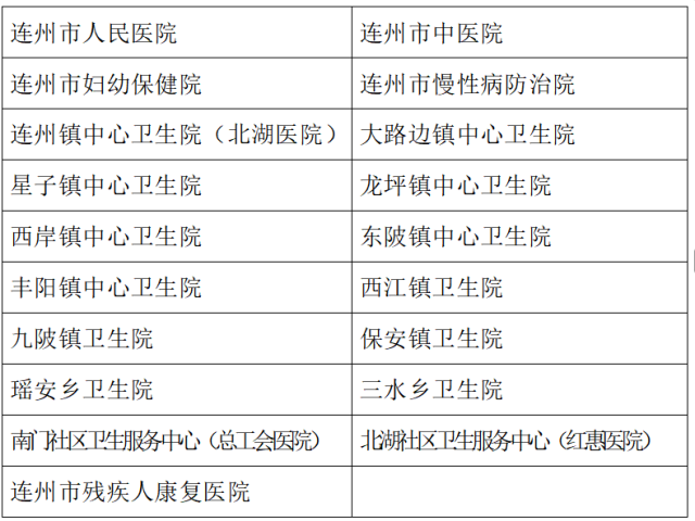 答:2026年1月1日開(kāi)始,連州全市所有公立醫(yī)療機(jī)構(gòu)開(kāi)展相應(yīng)服務(wù)(具體名單見(jiàn)下表)。