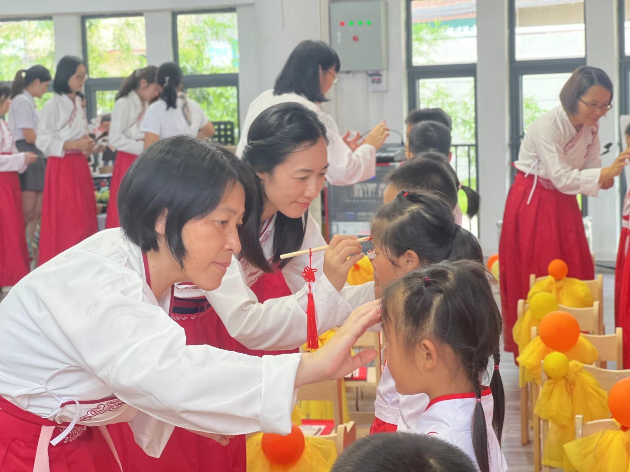 朱砂啟智—點(diǎn)朱砂又稱“開天眼”,寓意開啟智慧,老師為孩子們的額頭點(diǎn)上朱砂,為其“開智”,寓意著從此眼明心亮、聰明好學(xué)。