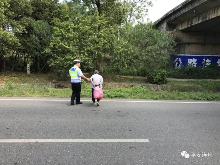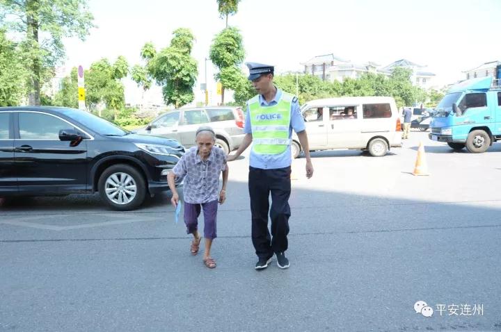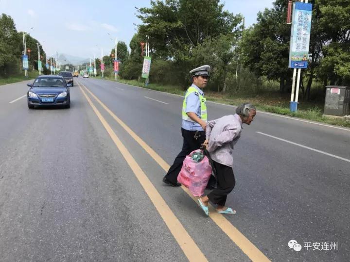 4老人家蹣跚步行過馬路,險(xiǎn)象環(huán)生,執(zhí)勤交警熱情相助,小心翼翼地扶老人家安全過馬路。