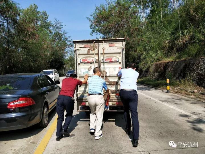 6四方井路段,小貨車與前方的車輛發(fā)生追尾事故,在路中間拋錨。途徑此處的交警為了疏導(dǎo)交通,幫助司機(jī)把車推至路邊,等候處理。