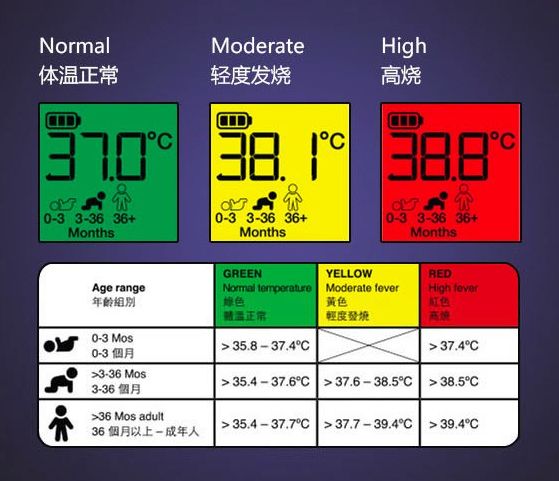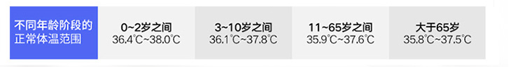 (3)額溫槍:不同年齡,正常范圍是不一樣的(如下圖),而且波動比較大,對于大部分來說(11歲-65歲),超過37.6℃是發(fā)熱。