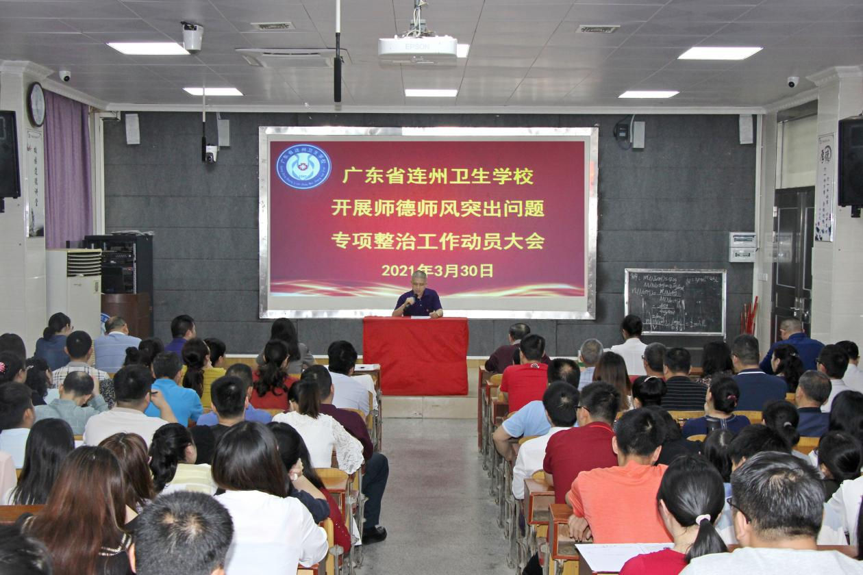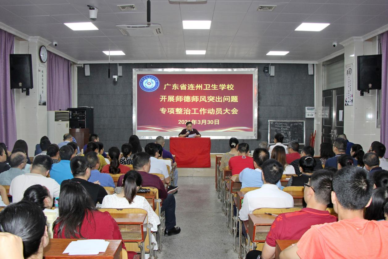 3月30日下午,連州衛(wèi)校召開師德師風(fēng)突出問題專項整治工作動員大會,號召全體教職工要充分認(rèn)識開展專項整治工作的重要意義,通過自查自糾等實際行動,提升教師品德修養(yǎng),爭做“四有”好老師。