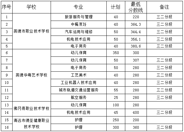 經(jīng)研究,現(xiàn)公布清遠(yuǎn)市第二批中等職業(yè)學(xué)校(含技工學(xué)校)部分專業(yè)招生錄取最低控制分?jǐn)?shù)線,具體如下: