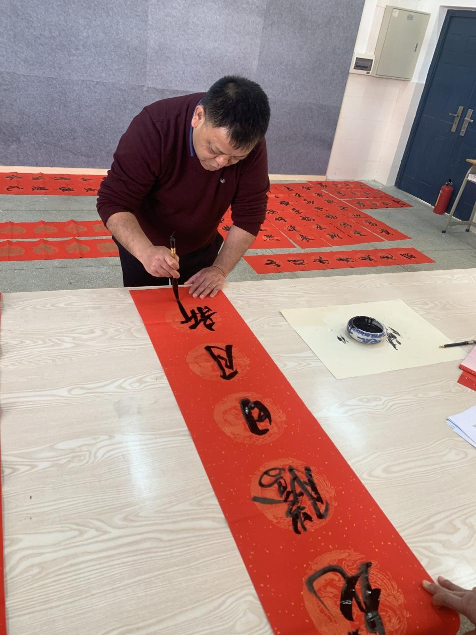 “門迎百福福星照,戶納千祥祥氣開”,老師們個(gè)個(gè)喜笑顏開,氣氛十分熱烈。三位老師把漢字的美態(tài)表現(xiàn)得淋漓盡致,將濃濃的新春祝福凝聚在筆尖,為新的一年帶來了別樣的溫暖。老師們有的駐足屏息觀賞、仔細(xì)體味,有的精心挑選著自己喜歡的福字和對聯(lián),還有的幫助老師們鋪紙研墨,助添書寫春聯(lián)的激情。一副副平安和諧、吉祥如意的春聯(lián),帶著揮別年、喜迎年,辭舊迎新的美好祝愿,一個(gè)個(gè)“福”字,寄托著喜慶團(tuán)圓的美好愿望和暖暖的祝福,為即將來臨的新春佳節(jié),增添了濃濃的喜慶氣氛。一副副飽含著濃濃年味、滿載著新春祝福的春聯(lián)寫出了我們每一個(gè)人對于來年美好生活的向往和祈盼,同時(shí)寓意著我校2022年各項(xiàng)事業(yè)紅紅火火,繁榮昌盛。