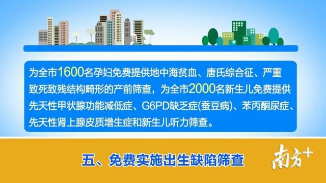 五、免費實施出生缺陷篩查。為全市1600名孕婦免費提供地中海貧血、唐氏綜合征、嚴重致死致殘結構畸形的產(chǎn)前篩查,為全市2000名新生兒免費提供先天性甲狀腺功能減低癥、G6PD缺乏癥(蠶豆病)、苯丙酮尿癥、先天性腎上腺皮質增生癥和新生兒聽力篩查。(主管部門:市衛(wèi)生健康局)