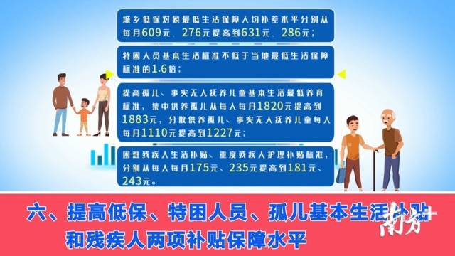 六、提高低保、特困人員、孤兒基本生活補貼和殘疾人兩項補貼保障水平。城鄉(xiāng)低保對象最低生活保障人均補差水平分別從每月609元、276元提高到631元、286元;特困人員基本生活標準不低于當?shù)刈畹蜕畋U蠘藴实?.6倍;提高孤兒、事實無人撫養(yǎng)兒童基本生活最低養(yǎng)育標準,集中供養(yǎng)孤兒從每人每月1820元提高到1883元,分散供養(yǎng)孤兒、事實無人撫養(yǎng)兒童從每人每月1110元提高到1227元;困難殘疾人生活補貼、重度殘疾人護理補貼標準,分別從每人每月175元、235元提高到181元、243元。(主管部門:市民政局)