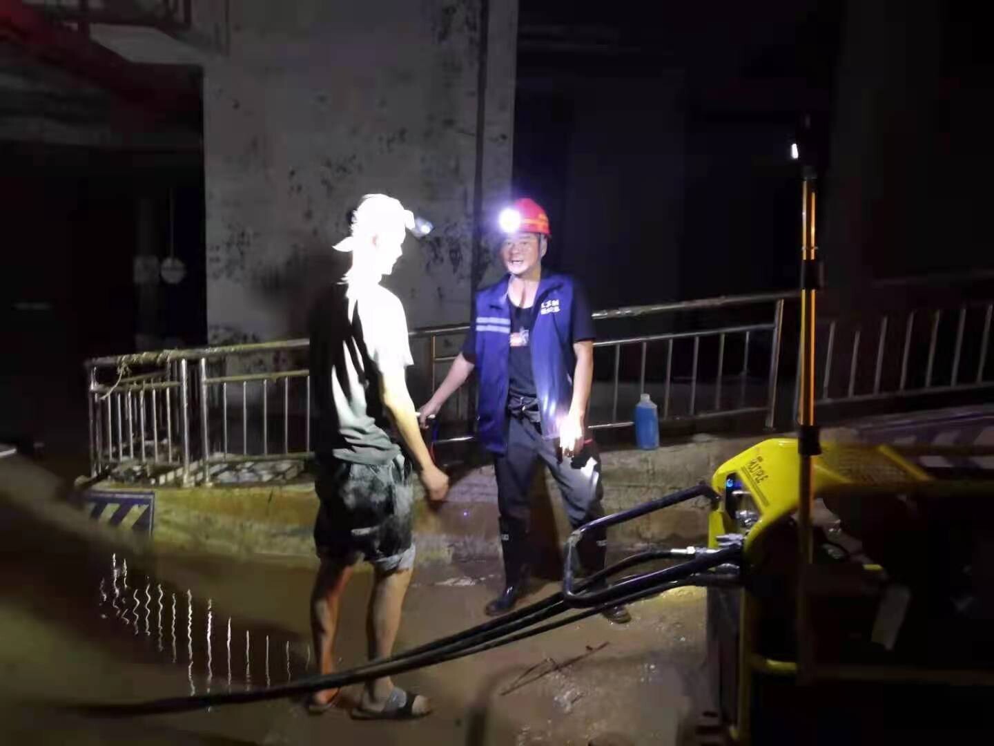 黃國軍和隊(duì)員一起接駁通風(fēng)管 黃國軍在積水車庫指導(dǎo)排水救援工作