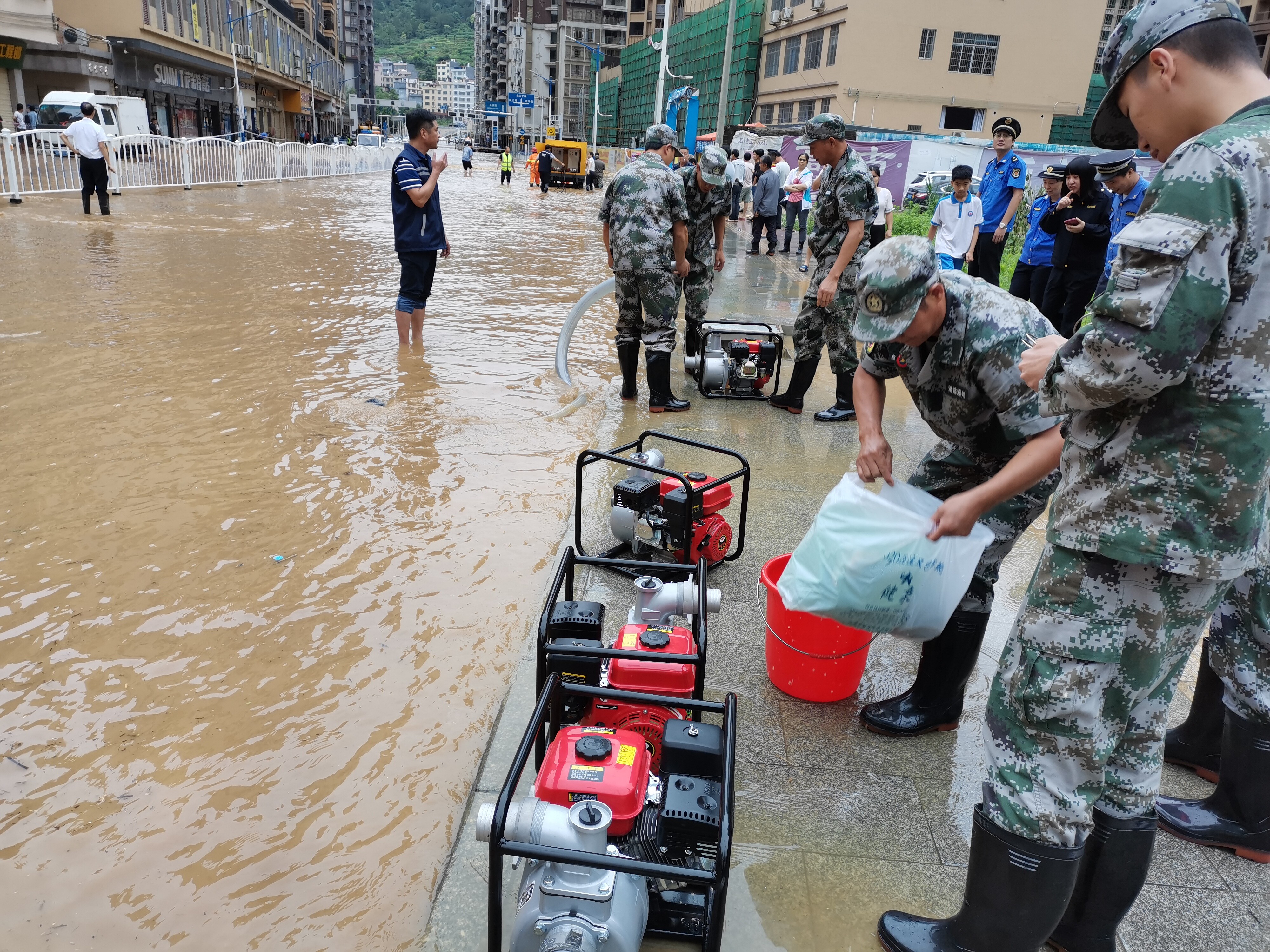 救援隊(duì)在現(xiàn)場排澇