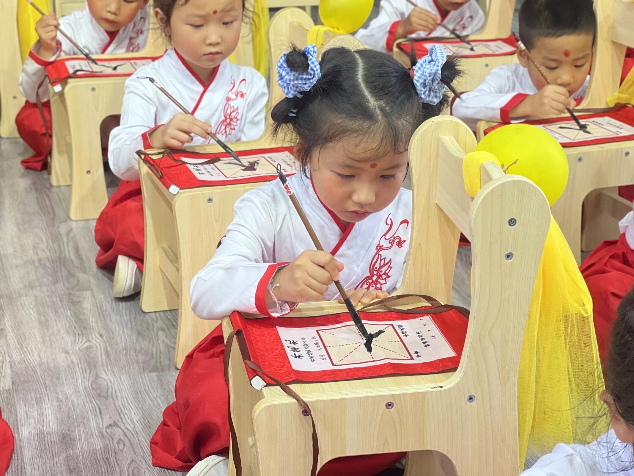 朱砂啟智—點(diǎn)朱砂又稱“開天眼”,寓意開啟智慧,老師為孩子們的額頭點(diǎn)上朱砂,為其“開智”,寓意著從此眼明心亮、聰明好學(xué)。