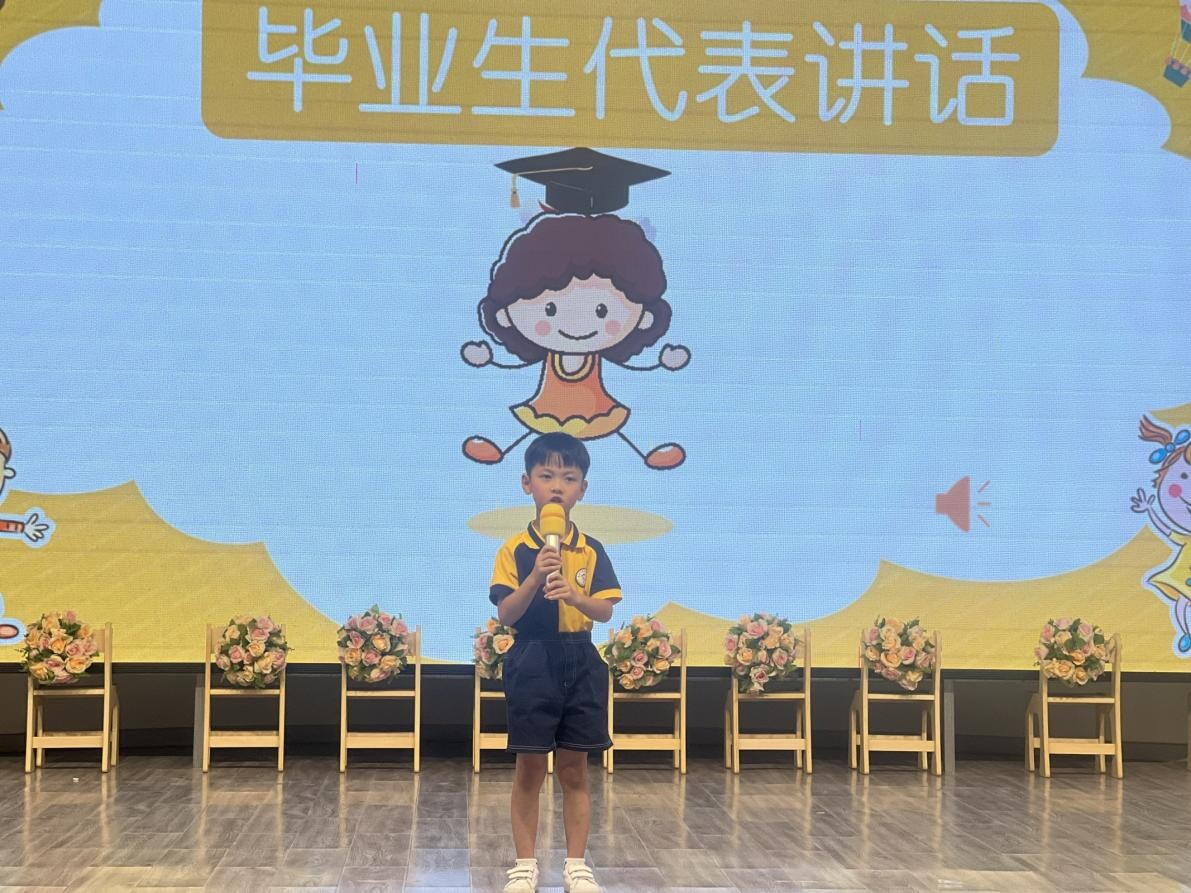畢業(yè)生代表講話——幼兒代表朱嘉軒、于奕揚(yáng)用童言稚語真誠地表達(dá)了對(duì)幼兒園的依依惜別之情和對(duì)老師的愛,感謝老師的辛勤教導(dǎo)、愛心哺育。